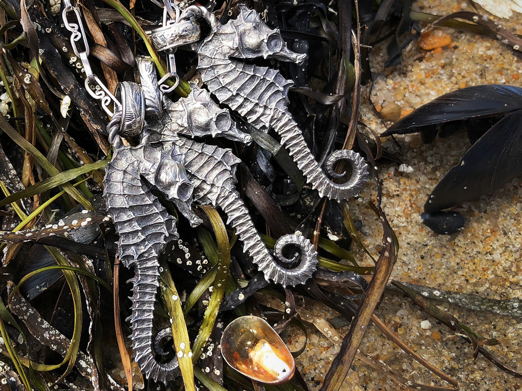 Set of three Sterling Silver Adriatic seahorses with floral patterned jumprings on rolo chain. Dimensions- Chain 28″ Seahorses 2″ L X 1″ W