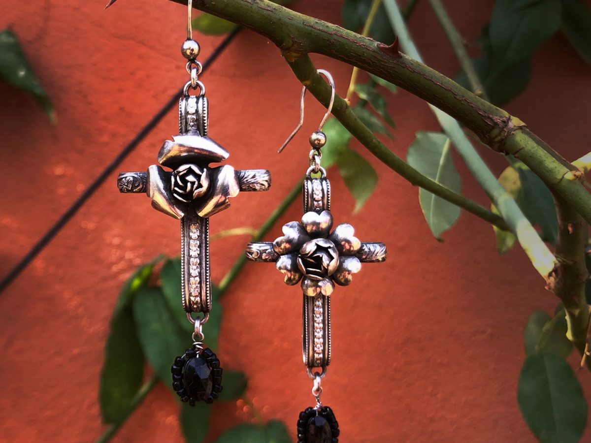Sterling Silver hand forged earwires hold two floral patterned crosses with two distinct center flowers. Each earring adorned with Jet glass rosettes. Jet is used for it’s protective qualities and ability to deflect the gaze of the evil eye. Length- 2″ Width- 1.5″