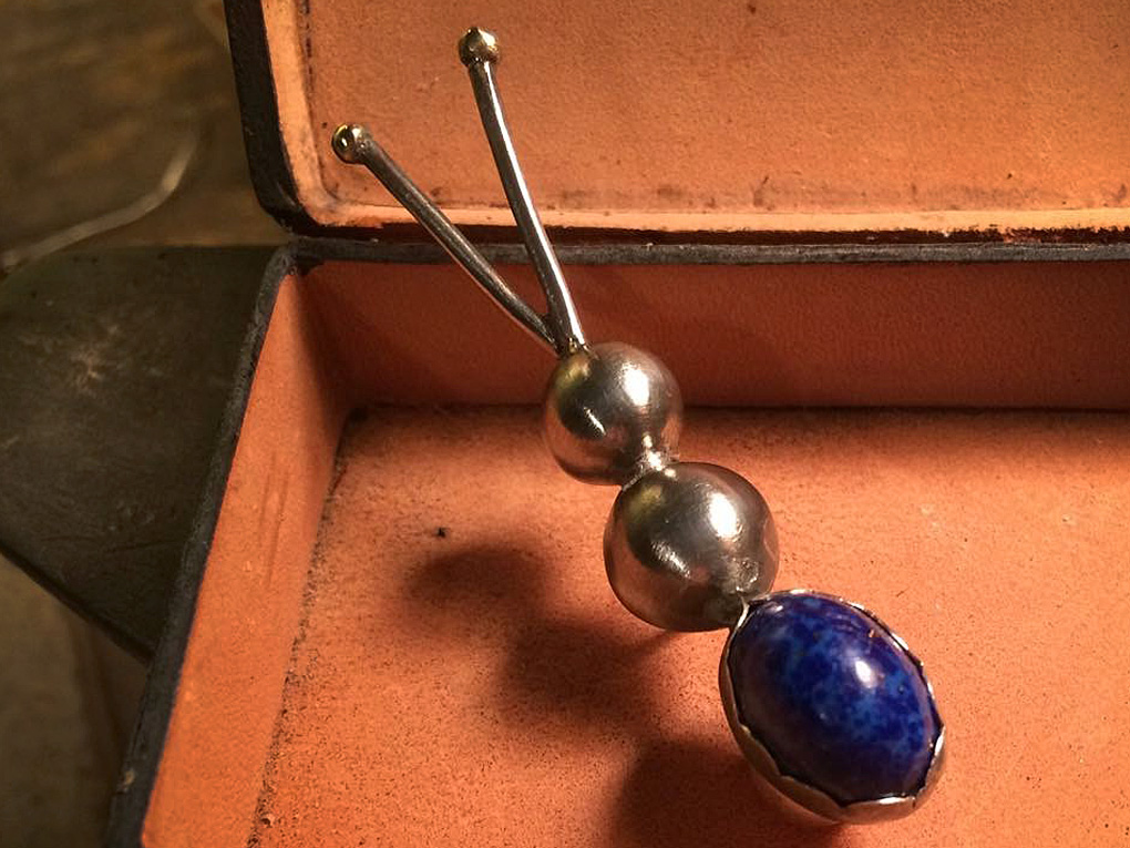Sterling Silver ant with blue lapis stone abdomen, 14K Gold tipped antennae and tack pinback. Dimensions- 3.5″ L X 1/2″ W