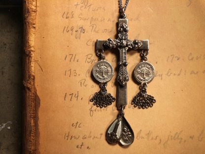 Sterling Silver cross with vintage Krebs zodiac charms, chain tassels and enamelled slide opening Mary charm. Dimensions- Chain- 24″ Cross 2 3/4″ L X 1 1/2″ W