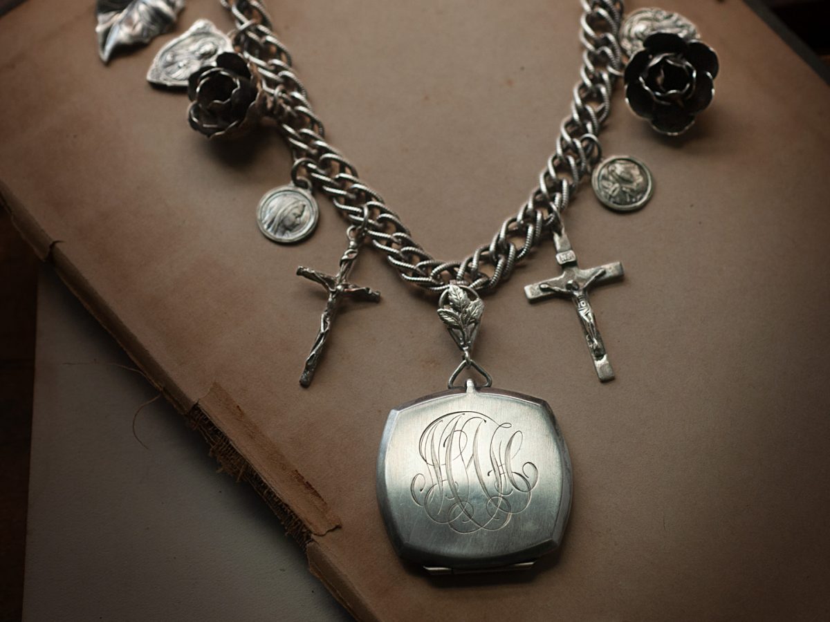 Vintage Sterling Silver locket pendant adorned with roses, crosses and saint charms. The roses are a symbol of balance, new beginning and hope. The locket can hold two images. Locket- 1.5″ X 1.5″ Chain- 24″