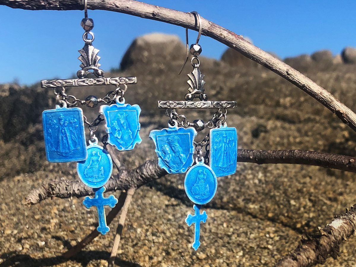 Fine Silver Ocean Blue enameled charm earrings with St. Genevieve, Infant of Prague, Mary and French cross, cut steel beads, sterling silver hand forged earwires. Dimensions- 3″L X 1.5″W