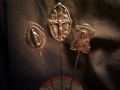 Set of three Sterling Silver vintage saint charms of Mary, Christ on Cross, and St. Theresa on hand forged wires with tack pinbacks. Dimensions- 3″ L X 1″ W