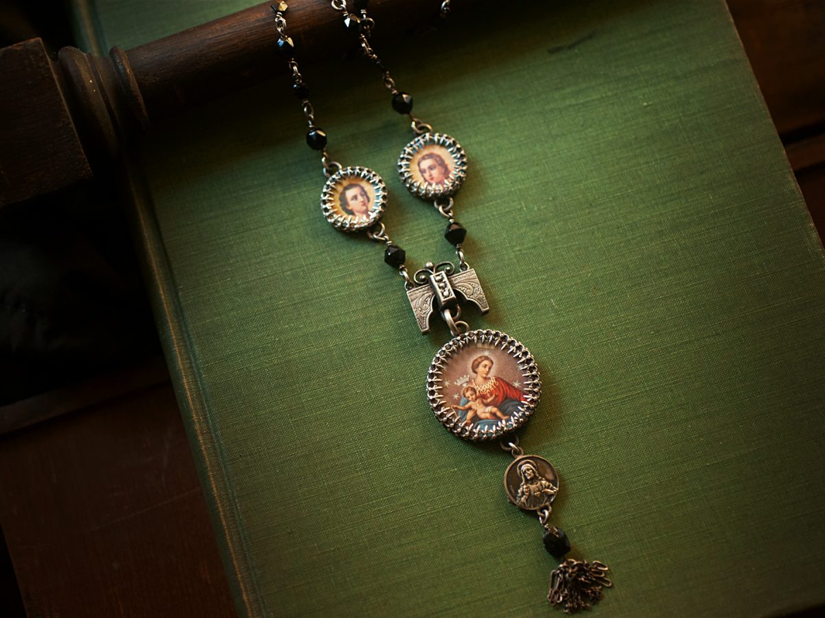 Portraits of Sta. Rosalia the patron saint of Palermo and Twin Brothers Cosmas and Damian patron saints of surgeons and physicians are set under crystal with reclaimed Victorian Jet Glass chain with Sterling Jesus charm and tassel.